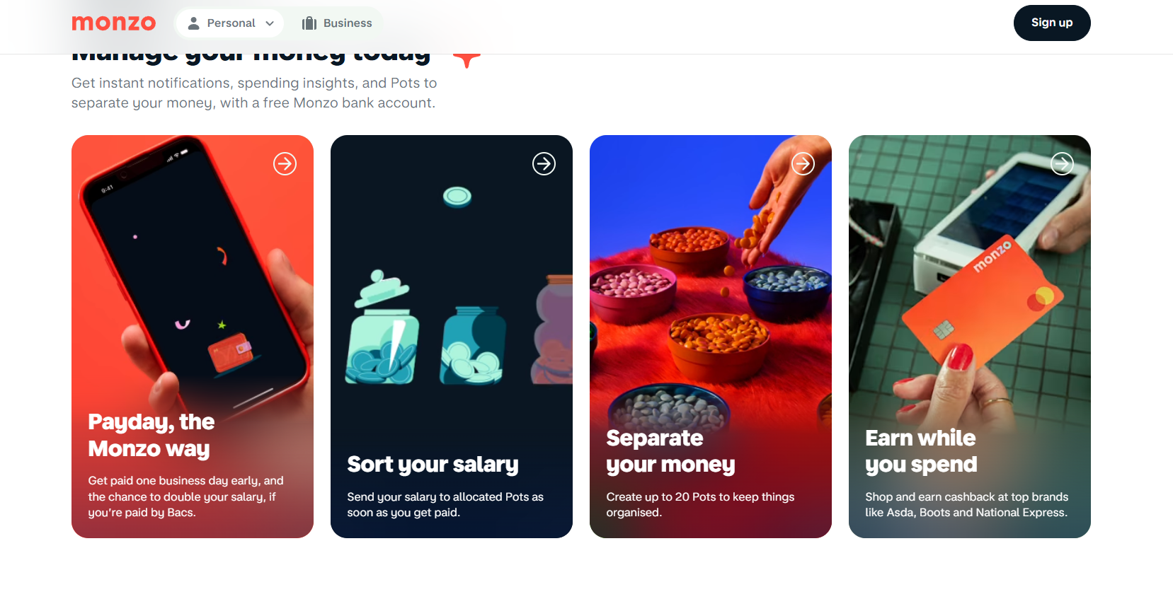 Monzo follows a similar approach in the UK, though what makes them interesting is the tension between their story and their features. Visit their homepage and you will find product-led copy: “Payday, the Monzo way”, “Sort your salary”, “Separate your money.” On the surface it reads like a feature list. But look closer and you notice something: every single one of those cards is written from the customer’s perspective, describing an outcome rather than a function. “Earn while you spend” is not a feature. It is a feeling. The story Monzo tells, one of control, clarity, and a bank that actually works for you rather than against you, is so embedded in how they write that it shows up even in the functional parts of the site. By the time someone is reading about Pots and payday advances, they are not evaluating a bank account. They are already inside the story.